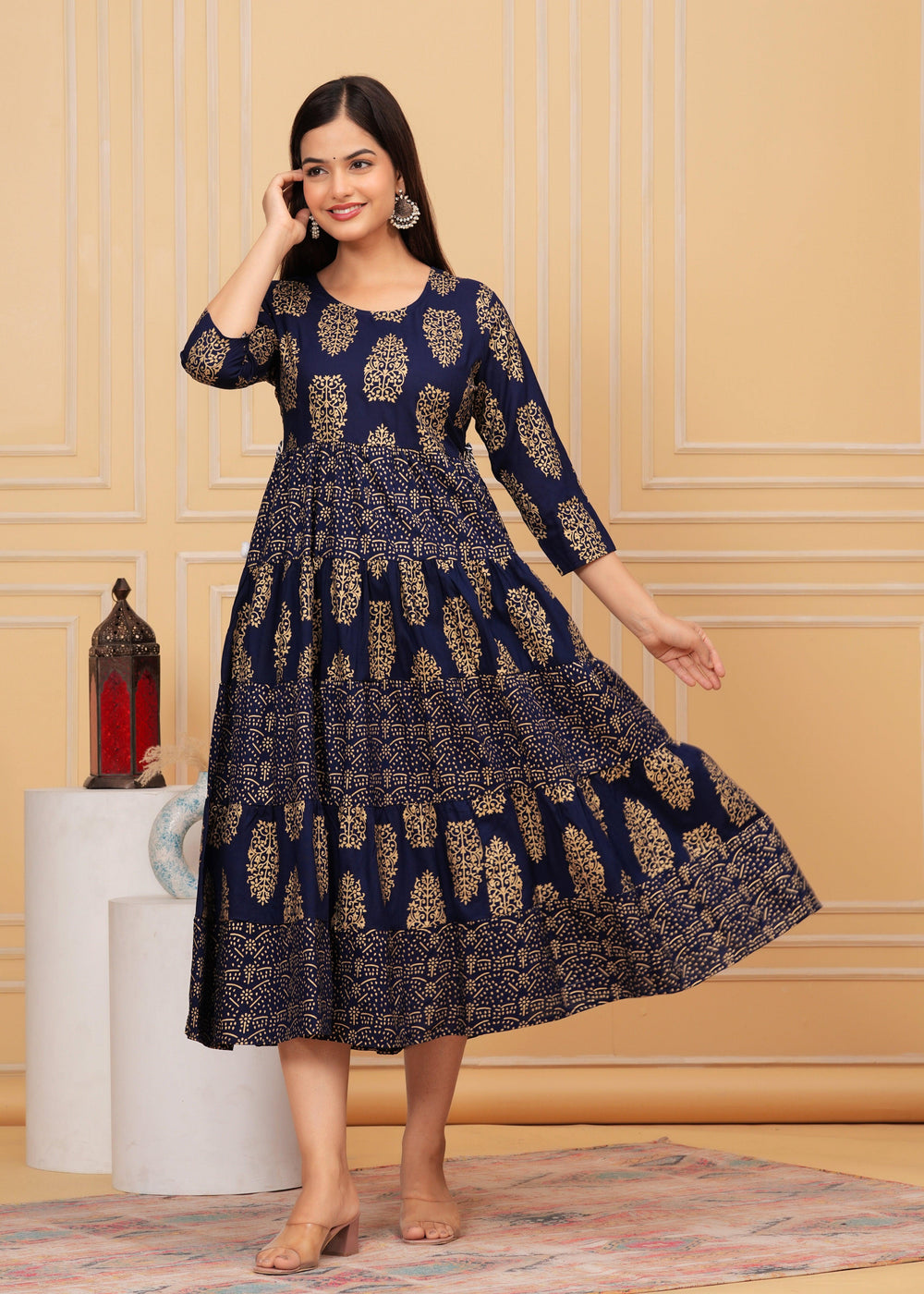 Elevate your style with our Dark Blue Gold Printed Rayon Anarkali Gown. Crafted with exquisite attention to detail, this gown features intricate gold prints on a rich dark blue backdrop, exuding elegance and charm. Its flowing silhouette and flattering anarkali cut make it a perfect choice for special occasions, weddings, or festive celebrations. Made from high-quality rayon fabric, it offers comfort and grace in every step. Dress to impress with this timeless piece that seamlessly blends traditional allure with contemporary flair.
