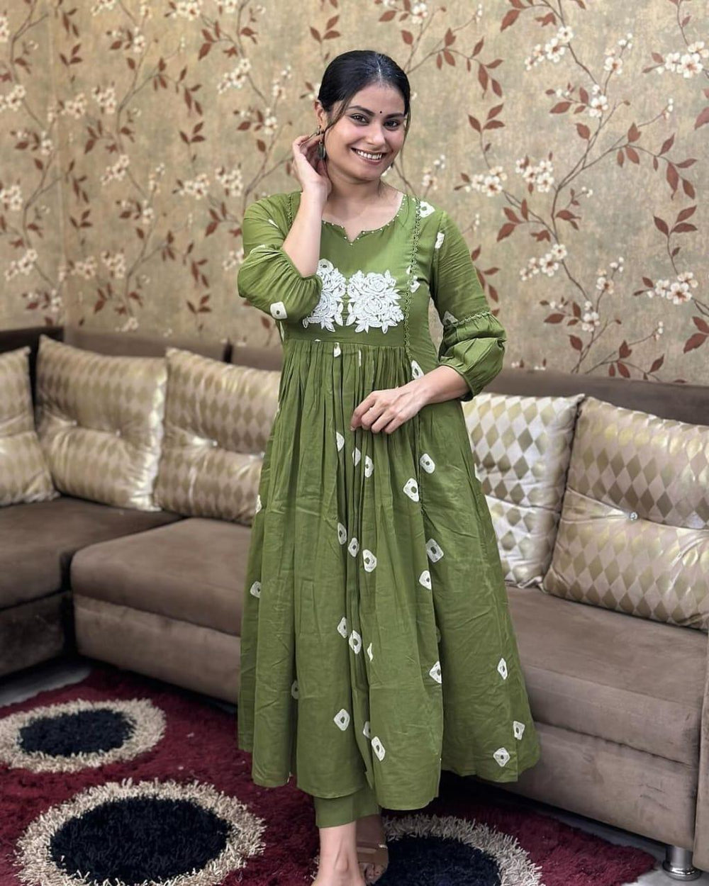 Elevate your style with our Green Embroidered Cotton Anarkali Kurta and Pant Set. Made from high-quality cotton, this set features intricate embroidery that adds a touch of elegance. Perfect for any occasion, this comfortable and stylish set is a must-have for any fashion-forward individual.
