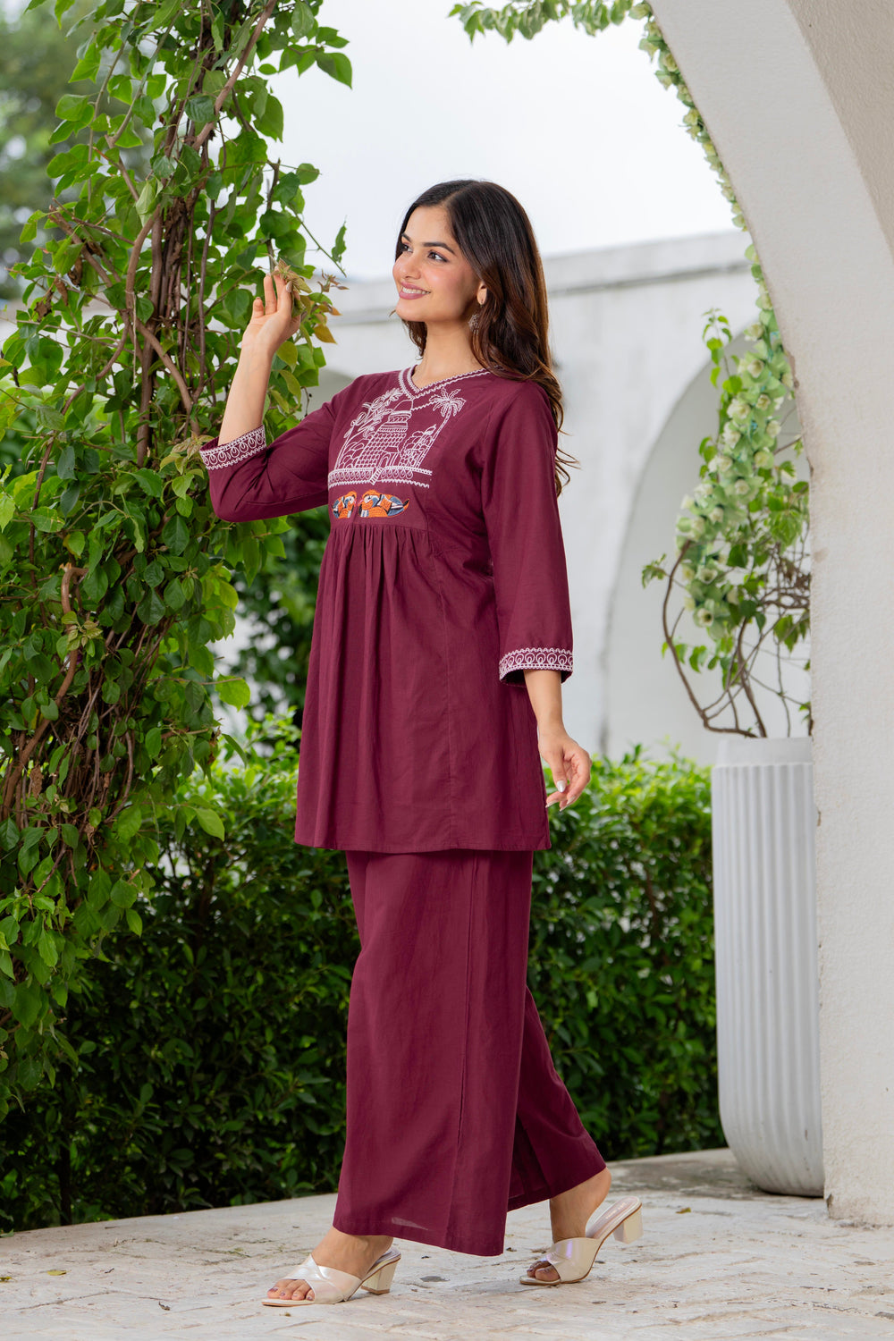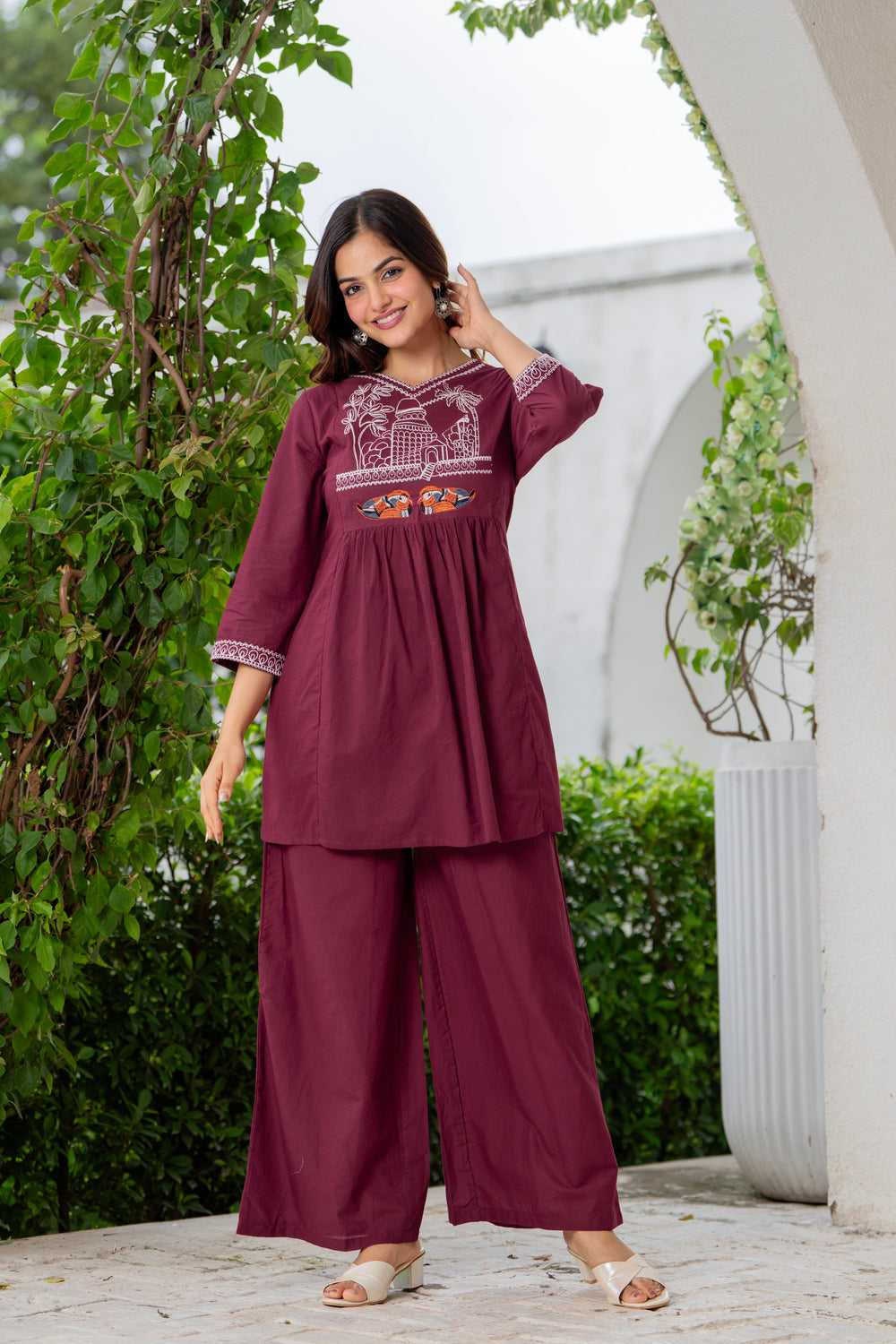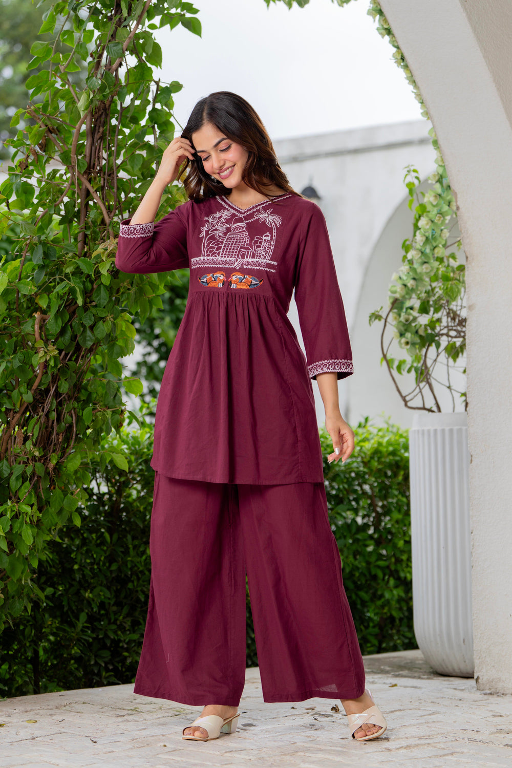 Elevate your wardrobe with this Maroon Embroidered Cotton Co-Ord Set, crafted for comfort and style. Made from breathable cotton, it keeps you cool while the intricate embroidery adds a touch of elegance. Perfect for casual outings or festive occasions, this coordinated set ensures a polished, refined look with minimal effort. Its rich maroon shade complements a variety of skin tones, making it a versatile addition to your collection.
