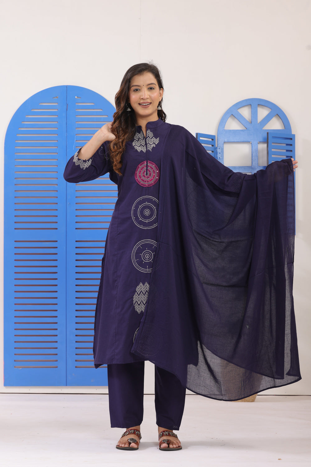Elevate your ethnic wardrobe with this Navy Blue Embroidered Cotton Suit Set, featuring intricate embroidery that adds a touch of elegance. Crafted from breathable cotton, it ensures comfort throughout the day. The matching dupatta completes the look, making it perfect for festive occasions or casual gatherings. This suit set combines style and comfort effortlessly, ideal for those seeking traditional charm with modern ease.